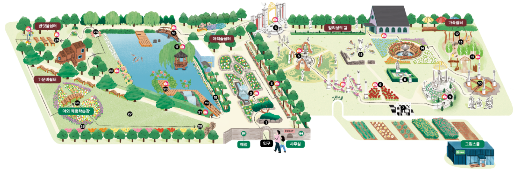 🥾 추천 코스: 플라워로드 → 동물 체험존 → 곤충전시관 → 언덕 전망대