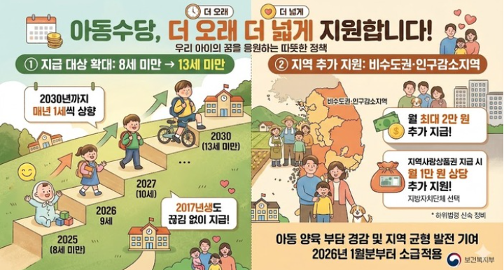 아동을 키우는 가정이라면 반드시 확인해야 할 정책 변화가 있습니다. 바로 아동수당 지급 대상이 대폭 확대되는 제도 개편입니다. 그동안 아동수당은 8세 미만 아동에게만 지급되는 제도였지만, 앞으로는 지급 연령이 13세 미만까지 단계적으로 확대됩니다. 또한 지방 거주 아동에게는 추가 지원이 신설되어 지역 간 돌봄 격차를 완화하는 정책도 함께 추진됩니다.