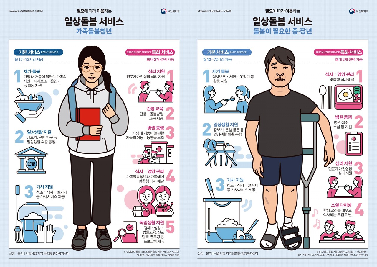 ‘일상돌봄 서비스’는 보건복지부가 추진하는 새로운 복지 제도입니다. 기존의 노인, 장애인, 아동 중심에서 벗어나, 만 40세부터 64세까지의 중장년층과, 만 13세부터 34세까지의 가족돌봄 청년을 지원 대상으로 삼아 돌봄 서비스를 제공합니다.