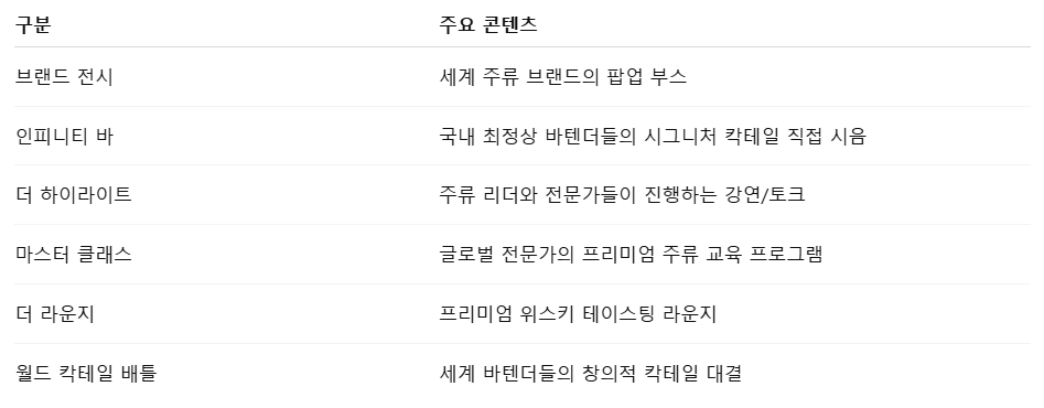 브랜드 부스마다 꾸며진 포토존, 바텐더 퍼포먼스 등으로 SNS 인생샷을 남기기 좋은 콘텐츠도 풍부합니다.