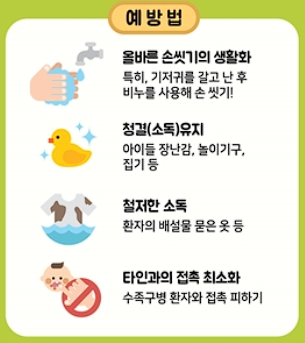 전염은 주로 발병 초기 1주일 동안 가장 활발하지만, 대변으로는 최장 4주간 바이러스가 배출되기도 합니다. 특히 어린아이들은 손을 자주 입에 넣는 습관이 있어 위생관리를 철저히 하지 않으면 가족 간 감염으로 이어질 수 있습니다.