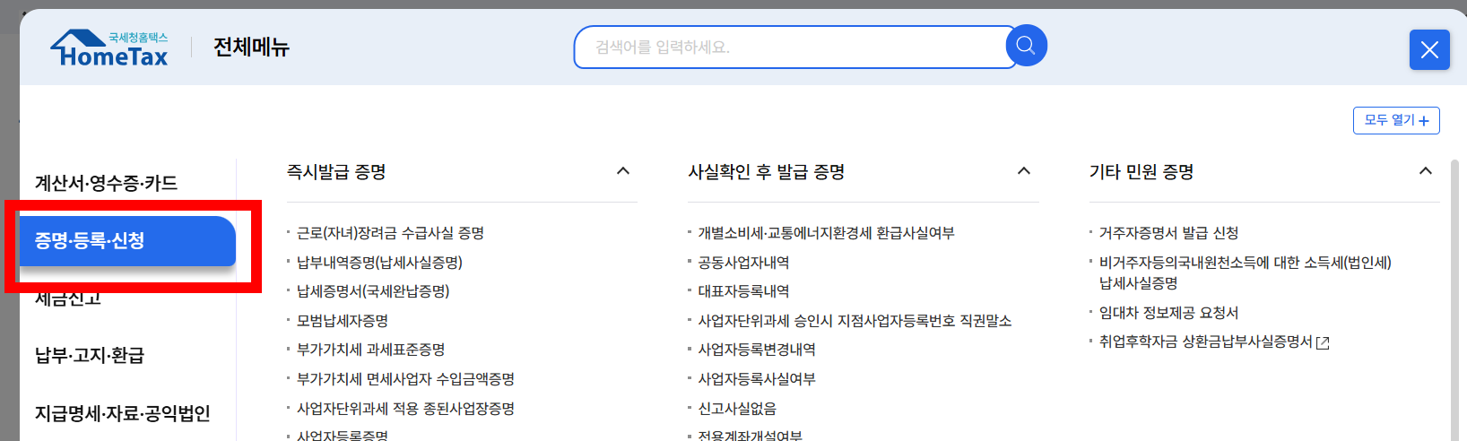 - 홈택스 접속 → 증명·등록·신청