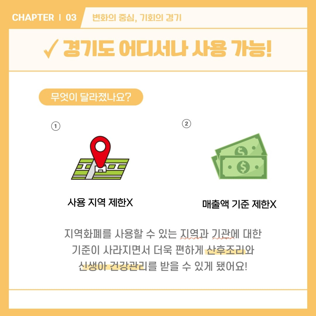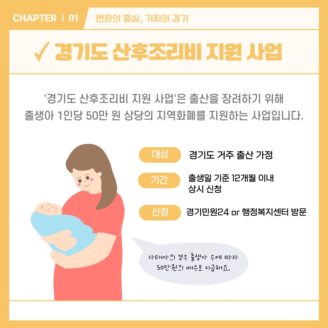 산후조리비는 단순한 현금성 지원이 아닌 지역화폐로 제공된다는 점에서 지역경제 활성화에도 기여합니다. 즉, 지원금이 지역 내 소상공인 업종에서 사용되도록 설계되어 있기 때문에 가정에는 혜택이 되고 동시에 경기도 경제에도 긍정적인 효과를 미치게 됩니다.