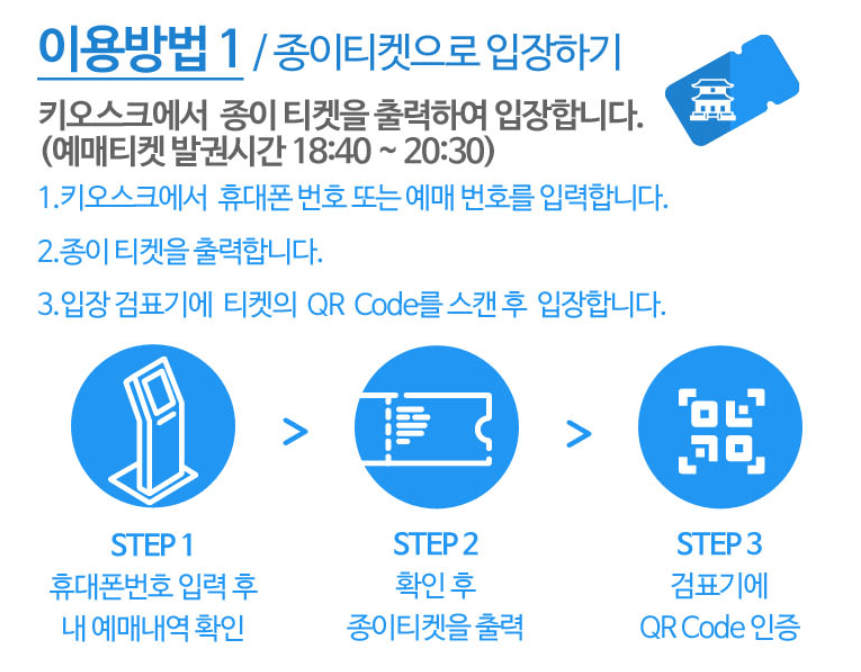 예매한 티켓은 모바일 QR 코드로 입장할 수 있으며, 원한다면 관람 당일 광화문 매표소에 설치된 무인 발권기에서 출력해 입장할 수도 있습니다. 다만, 일행이 있을 경우 반드시 함께 입장해야 하며, 개별 입장은 허용되지 않습니다. 티켓은 1장만 발급되므로 분실하지 않도록 주의가 필요합니다.