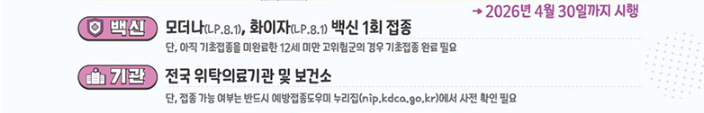 이번 절기 접종에는 모더나(LP.8.1)와 화이자(LP.8.1) 백신이 사용됩니다. 모두 1회 접종으로 면역 형성이 가능하도록 구성되어 있습니다. 특히, 아직 기초접종을 완료하지 않은 12세 미만 고위험군의 경우 기초접종을 반드시 먼저 완료해야 하며, 이후 절기 접종을 진행해야 합니다.